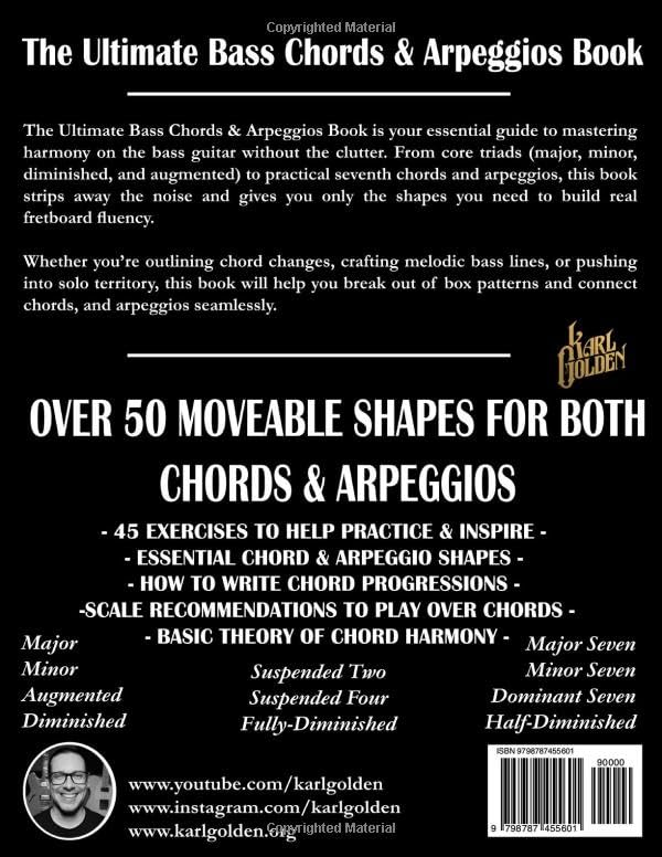 کتاب The Ultimate Bass Chords & Arpeggios Book یک منبع جامع و کاربردی برای نوازندگان گیتار بیس است که به‌دنبال یادگیری اصولی و پیشرفتهٔ آکوردها و آرپژها هستند. این کتاب با طراحی گرافیکی چشم‌ نواز و چیدمان دایره‌ ای از انواع گیتارهای باس روی جلد، نشان‌ دهندهٔ تنوع و گستردگی محتوای آموزشی آن است.